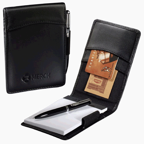 Features : Inside has pockets for business cards. Elastic pen loop (no pen included). 3" x 4.75" unlined writing pad included. Available in black.