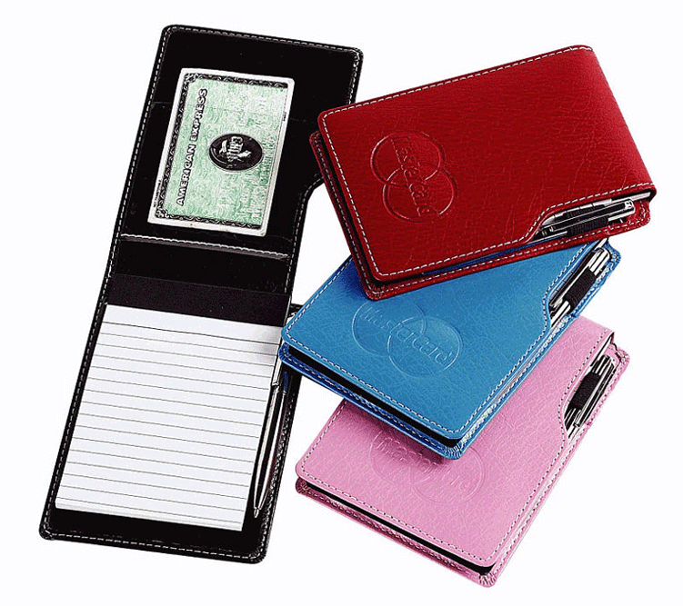 Features : Luxe bonded leather highlighted with a creamy contrast stitch. Pen loop (mini pen is included). 40 sheets ruled memo pad included. Top pocket holds extra business cards. Available in Black, Red Light Blue and Pink .